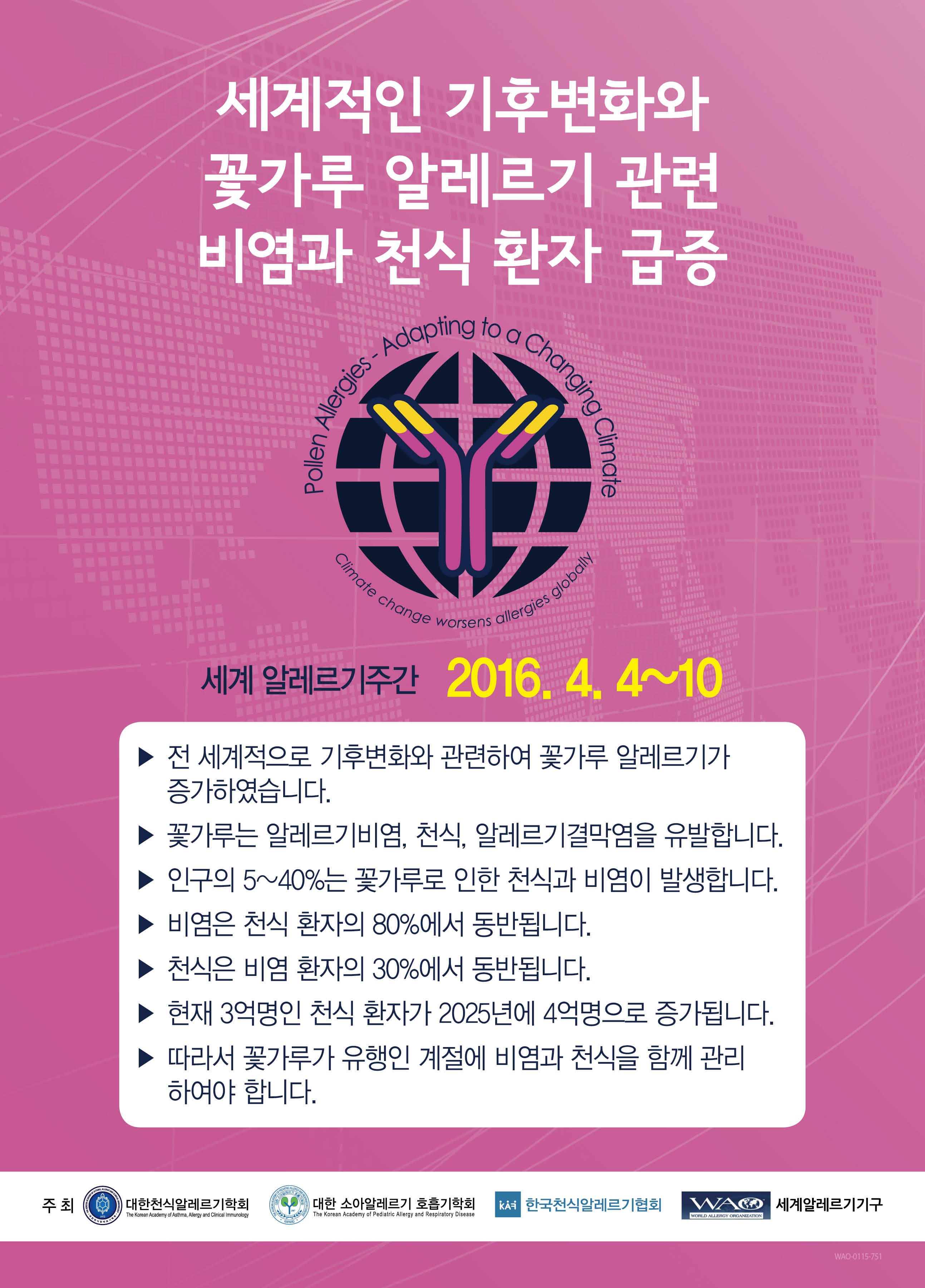 2016년World Allergy Week는 4월4일부터 10일 이며 올해의 캠페인 주제는 "기후 변화와 연관된 꽃가루 알레르기" (Pollen Allergies - Adapting to a Changing Climate)입니다.