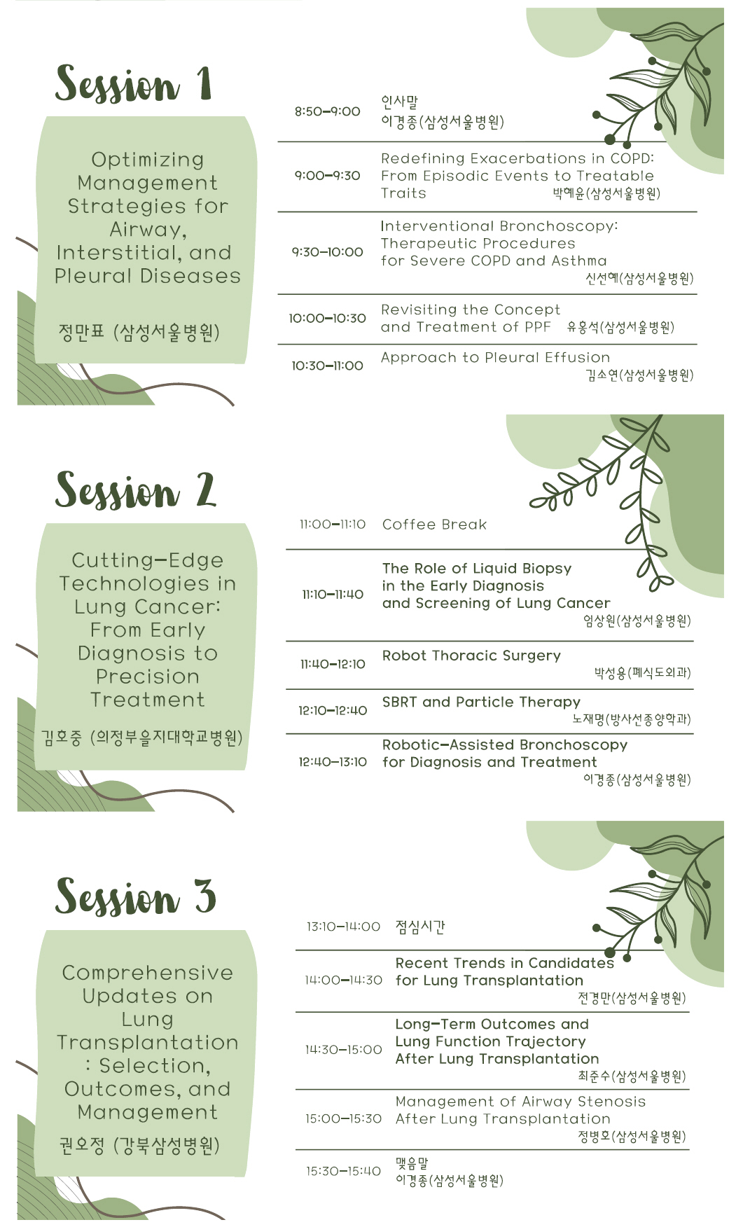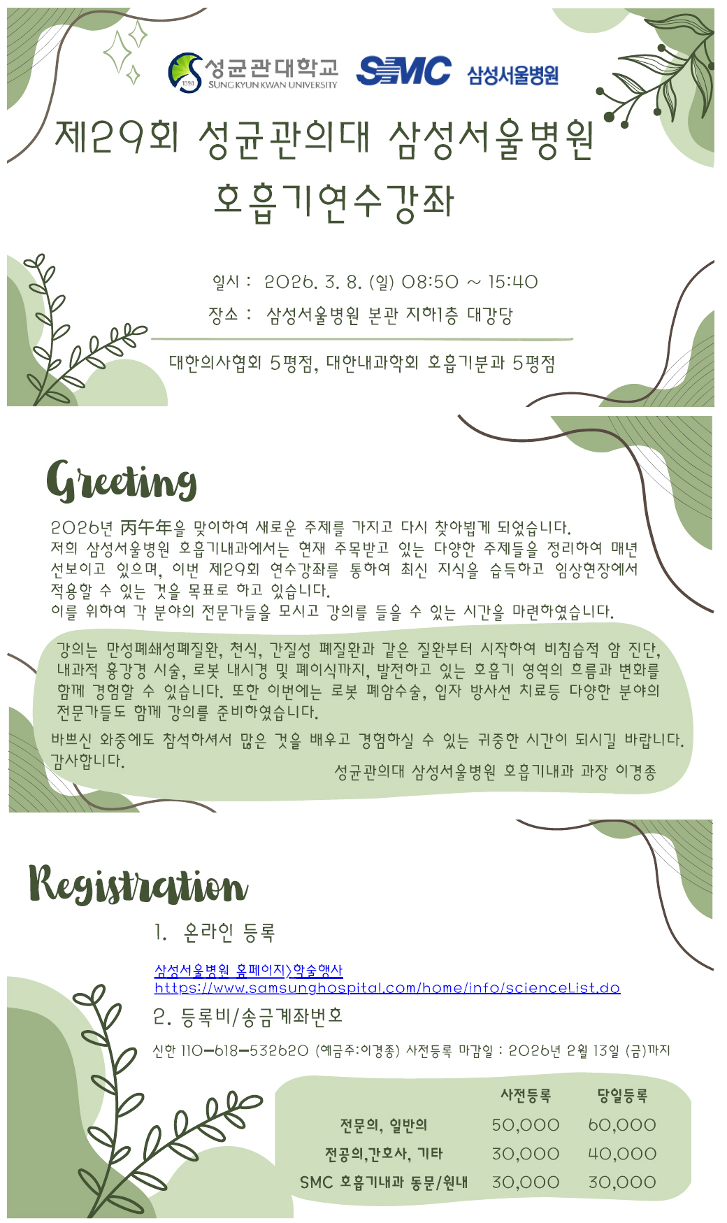 유관기관 제29회 성균관의대 삼성서울병원 호흡기 연수강좌 조회수 : 104 게시일 : 2026-01-06 https://www.samsunghospital.com/home/info/scienceView.do?seq=23190&cPage=1 목록