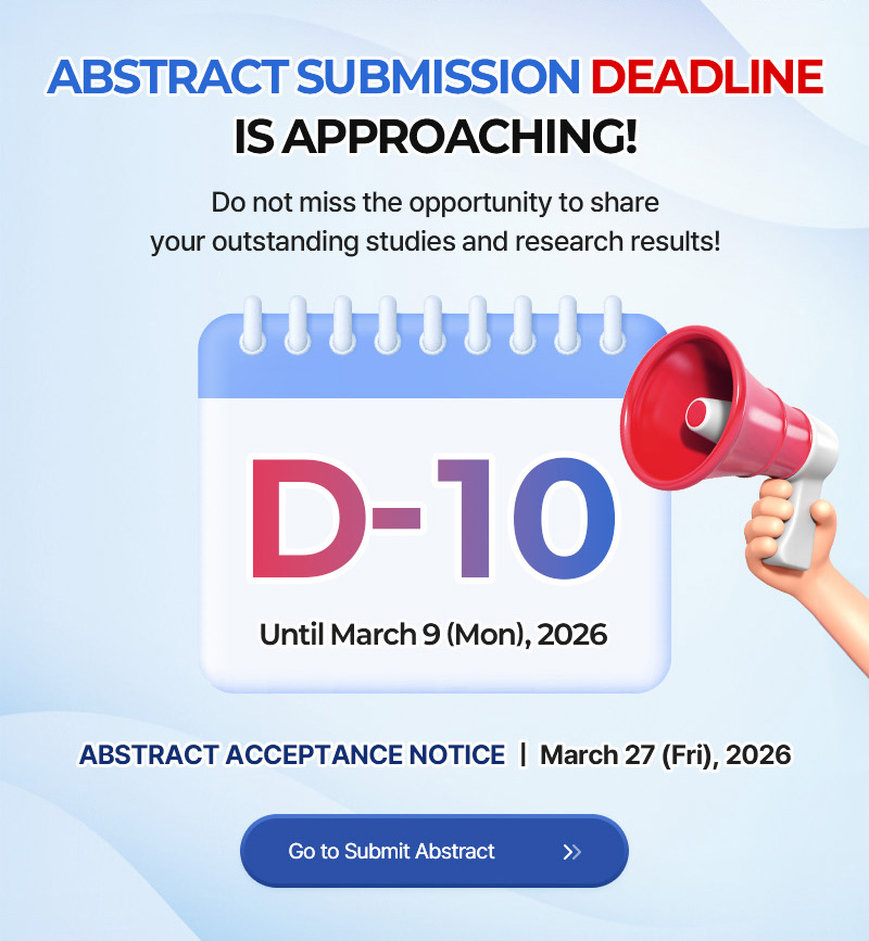 공지사항 *D-10* [KAAACI 2026] Abstract Submission Deadline Approaching (Deadline: March 9, 2026) 조회수 : 3 게시일 : 2026-02-27 목록
