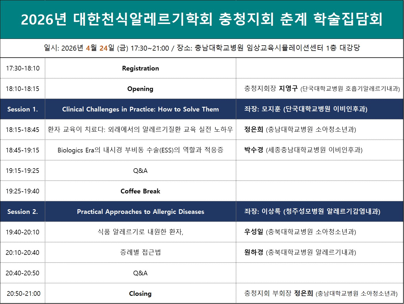 오늘 이 자리가 충청 지역의 알레르기 진료 수준을 한 단계 더 끌어올리는 의미 있는 시간이 되기를 바라며, 활발한 토론과 자유로운 의견 교환이 이루어지기를 기대합니다.