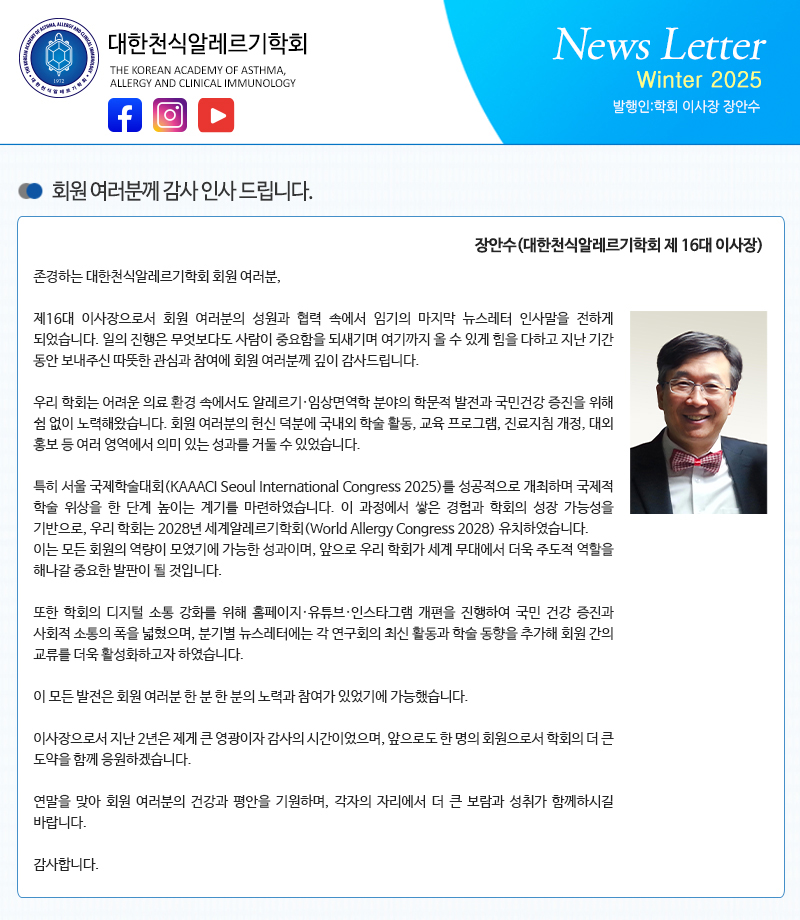 학술지 및 간행 학회소개 학회소식 자료실 학술지 및 간행 학술행사 진료지침 일반인정보 Membership / My Page 뉴스레터 뉴스레터 최신논문소식 교과서 안내 AAIR AARD 천식 및 알레르기