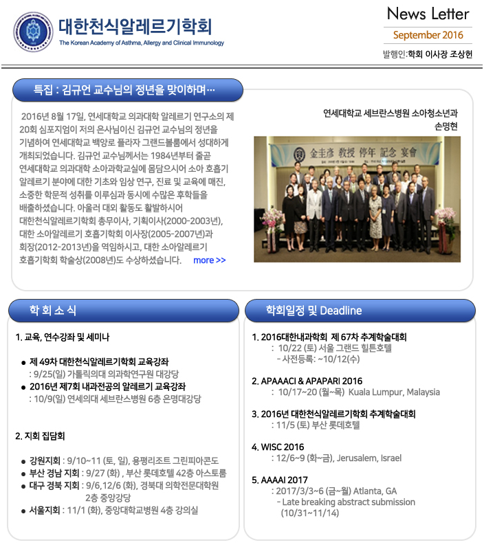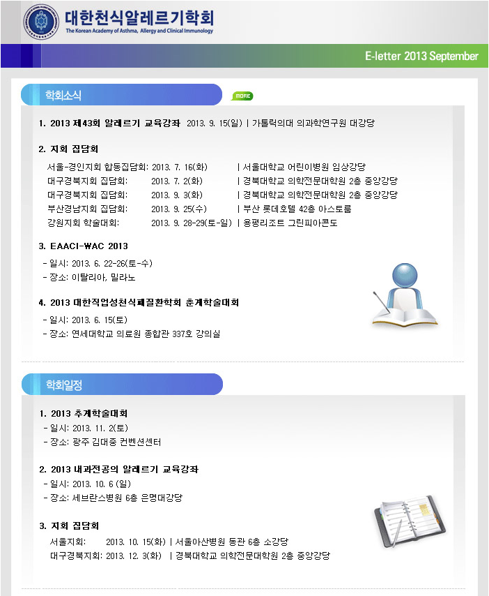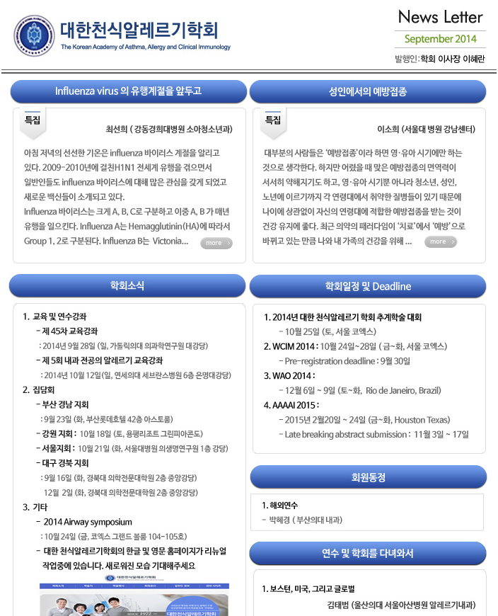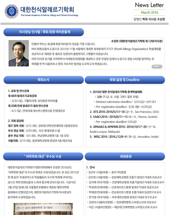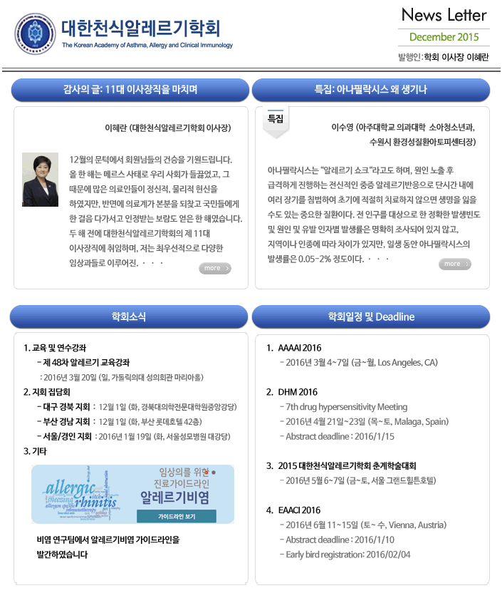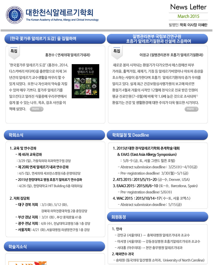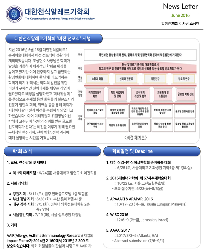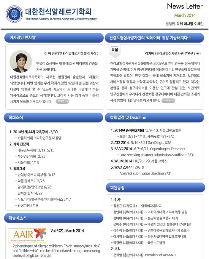 학술지 및 간행 학회소개 학회소식 자료실 학술지 및 간행 학술행사 진료지침 일반인정보 Membership / My Page 뉴스레터 뉴스레터 최신논문소식 교과서 안내 AARD소개 AAIR소개 천식 및 알레르기