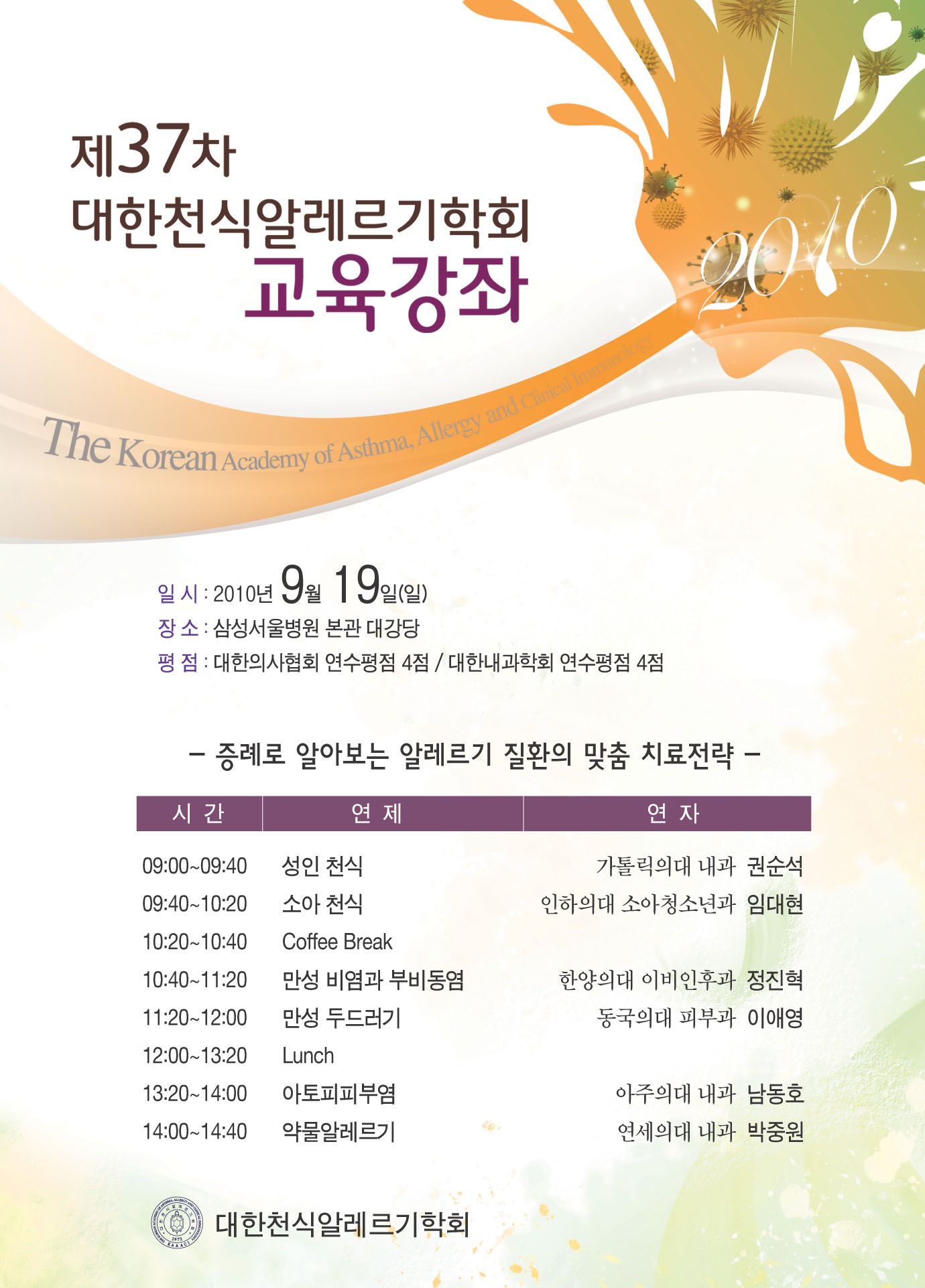 공지사항 9/19 제37차 대한천식알레르기학회 교육강좌 안내(~9/15까지) 조회수 : 2,562 게시일 : 2010-08-10 37차교육강좌초청장포스타.jpg (다운로드 : 141회) 목록