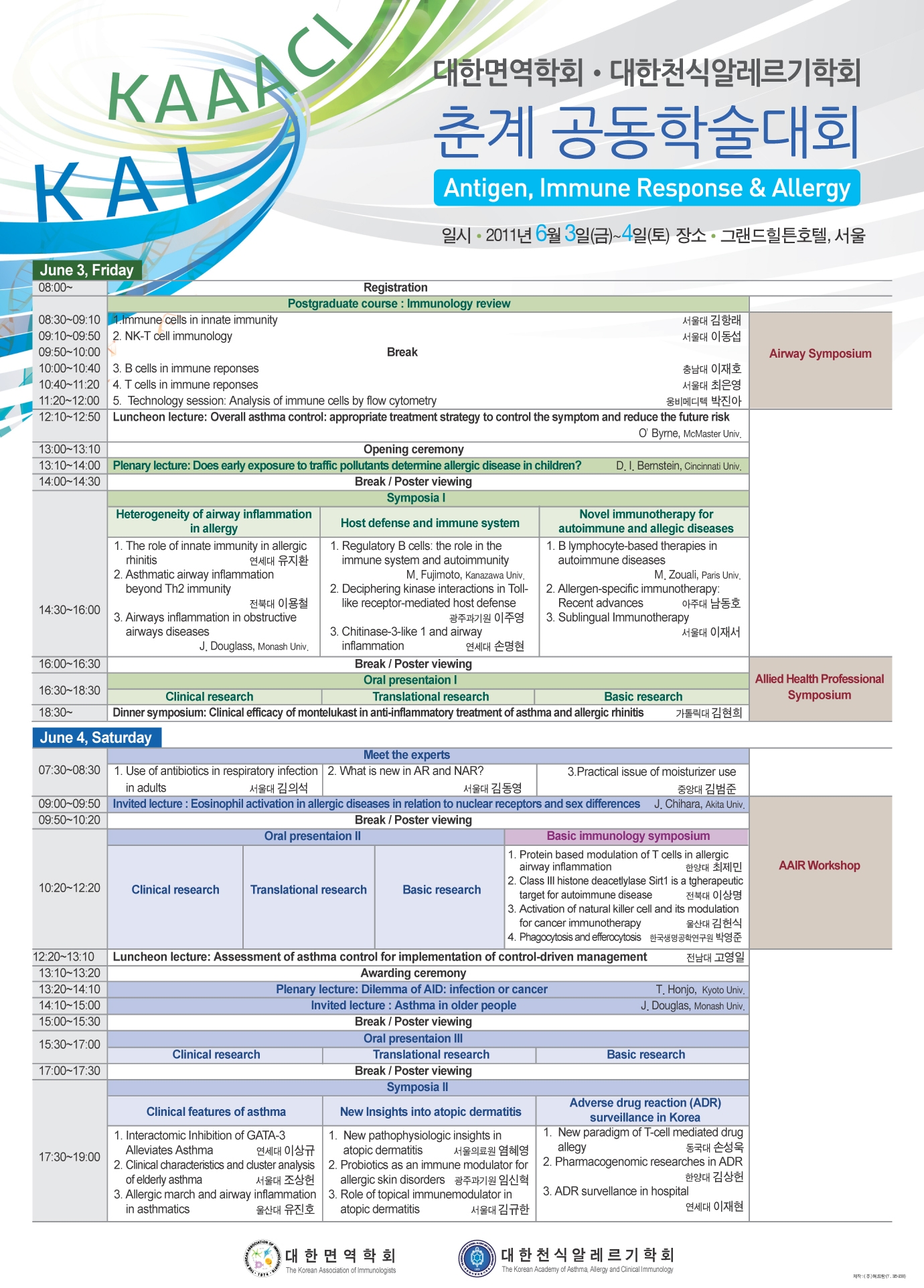 공지사항 2011 춘계학술대회 초록접수 마감 - 5/18(수)까지 조회수 : 2,016 게시일 : 2011-05-16 2011 대한천식알레르기학회 춘계학술대회 일 시 : 2011년 6월 3일 ~ 4일(금-토) 장 소 : 그랜드힐튼 호텔, 서울 초록접수 및 사전등록 일정 안내 - 초록접수 안내 : 4월 15일(금) ~ 5월 18일(수) - 사전등록 안내 : 4월 15일(금) ~ 5월 20일(금) 2011춘계포스터0516(1).jpg (다운로드 : 133회) 목록