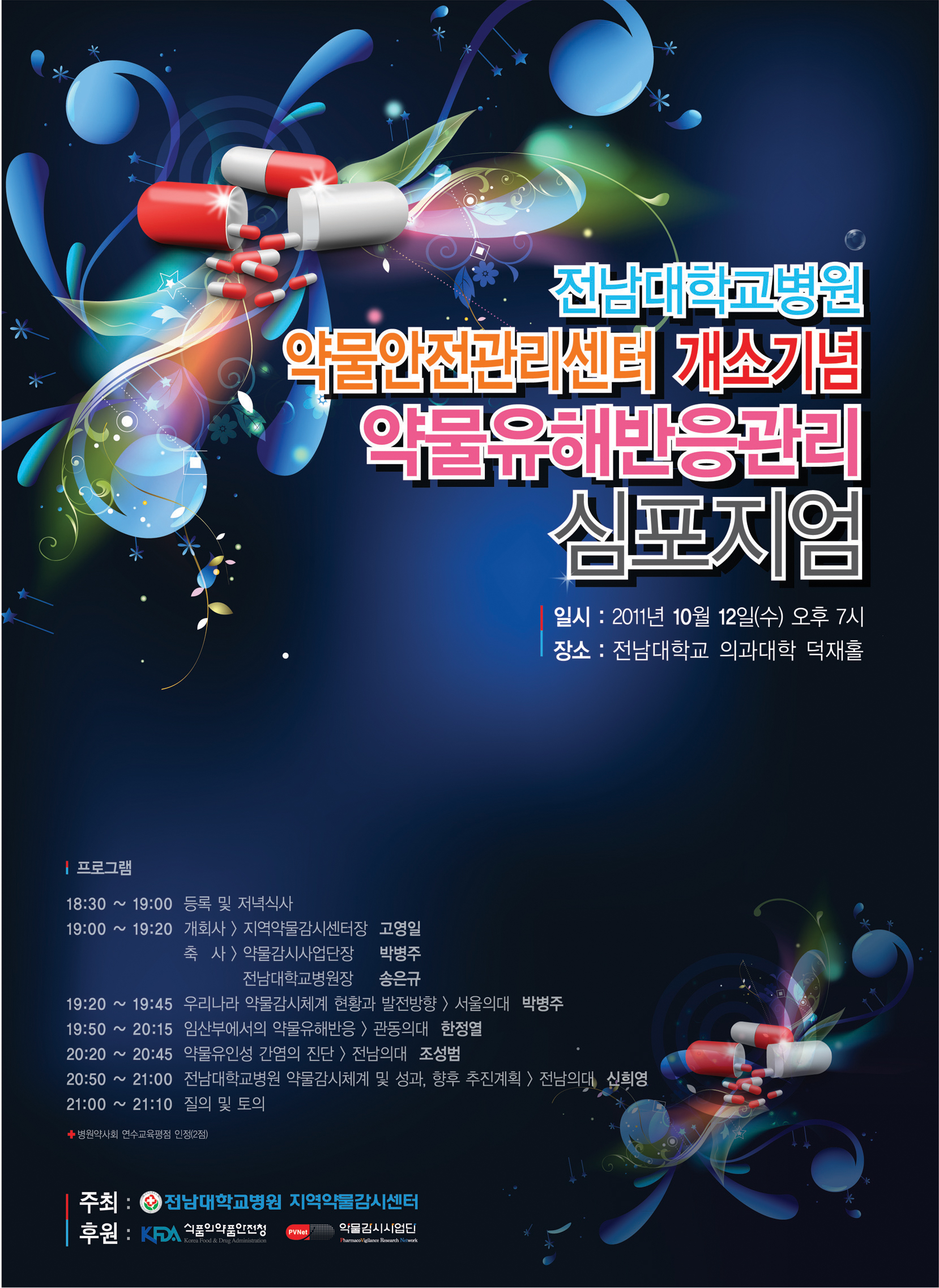 공지사항 전남대학교병원 약물안전관리센터 개소기념 약물유해반응관리 심포지엄 조회수 : 2,837 게시일 : 2011-09-22 안녕하세요 전남대학교병원 지역약물감시센터입니다. 저희 센터에서 2011년 10월 12일(수) 아래와 같이 심포지엄을 개최하오니, 많은 관심과 참여 부탁드립니다. - 아 래 - 전남대학교병원 약물안전관리센터 개소기념 약물유해반응관리 심포지엄 ○ 일 시 : "2011년 10월 12일(수) 19:00~21:10 ○ 장 소 : 전남대학교 의과대학 덕재홀 ○ 문 의 : (062) 220-5321 ○ 프로그램 시간 내용 연자 18:30~19:00 등록 및 저녁식사 19:00~19:20 개회사, 축사 19:20~19:45 우리나라 약물감시체계 현황과 발전방향 서울의대 박병주 교수 19:50~20:15 임산부에서의 약물유해반응 관동의대 한정열 교수 20:20~20:45 약물유인성 간염의 진단 전남의대 조성범 20:50~21:00 전남대학교병원 약물감시체계 및 성과, 향후 추진계획 전남의대 신희영 21:00~21:10 질의 및 토의 2011심포지엄초청장.jpg (다운로드 : 137회) 2011심포지엄포스터.jpg (다운로드 : 142회) 목록