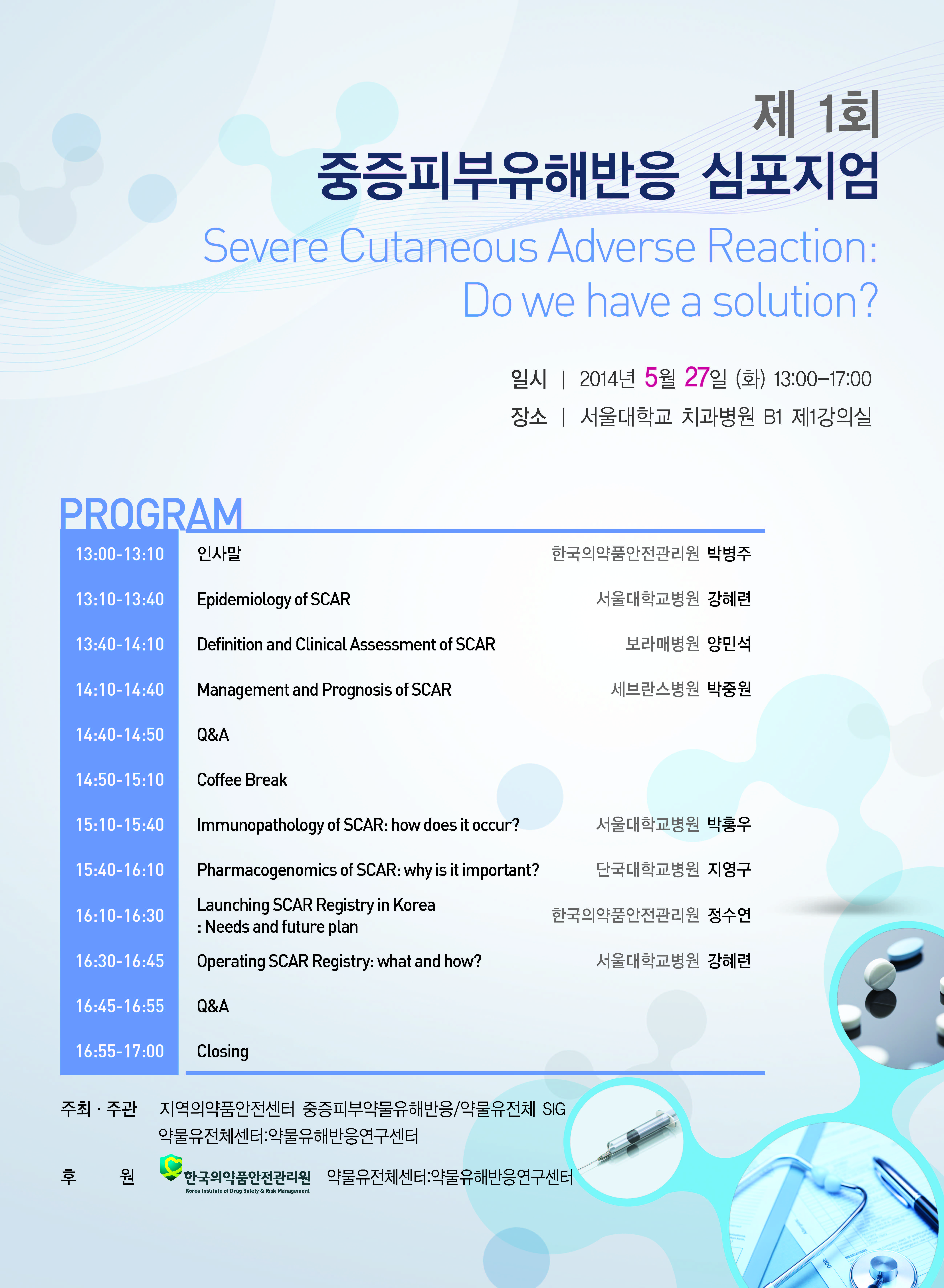 공지사항 [한국의약품안전관리원]제1회 중증피부유해반응 심포지엄 조회수 : 3,183 게시일 : 2014-04-17 중증피부유해반응심포지엄등록신청서.doc (다운로드 : 133회) 중증피부유해반응심포지엄포스터0411-2.jpg (다운로드 : 145회) 목록