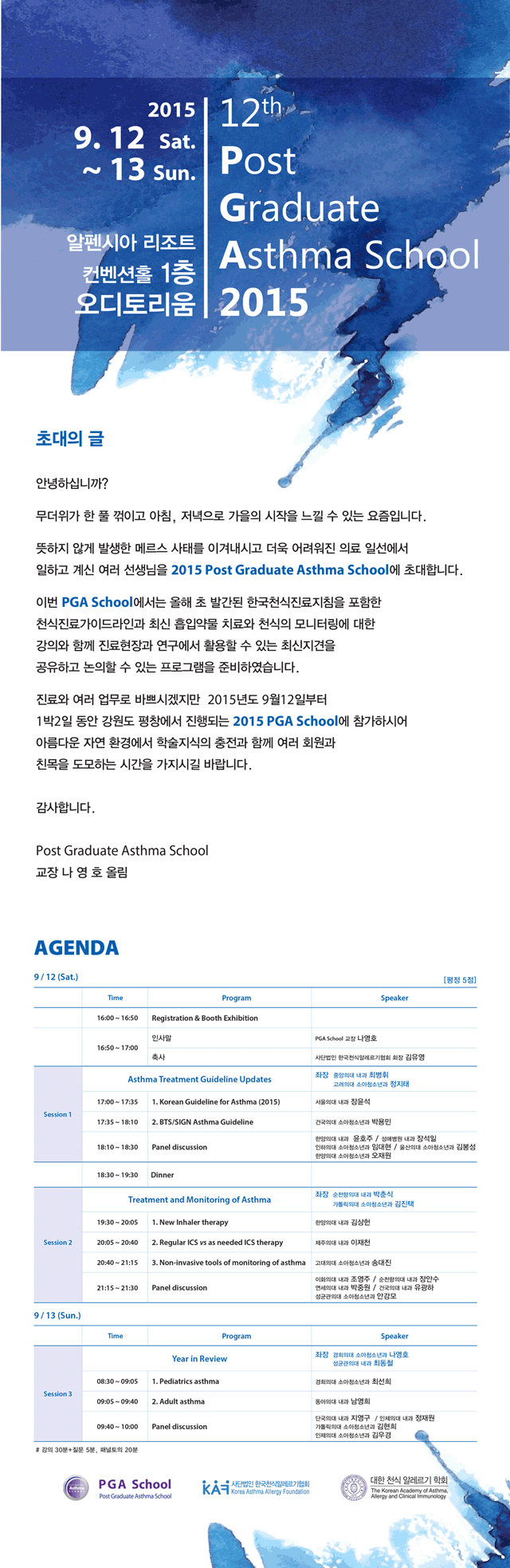 대한천식알레르기학회는 정보통신망법 제50조의 2, 제50조의 7 등에 의거하여, 대한천식알레르기학회가 운영,관리하는 웹페이지상에서, 이메일 주소 수집 프로그램이나 그 밖의 기술적 장치 등을 이용하여 이메일 주소를 무단으로 수집하는 행위를 거부합니다.