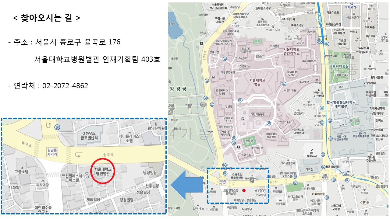 다. 제출방법 : 방문 또는 우편접수 - 방문접수 : 서울대학교병원 별관 4층 인재기획팀 – 약도 참조