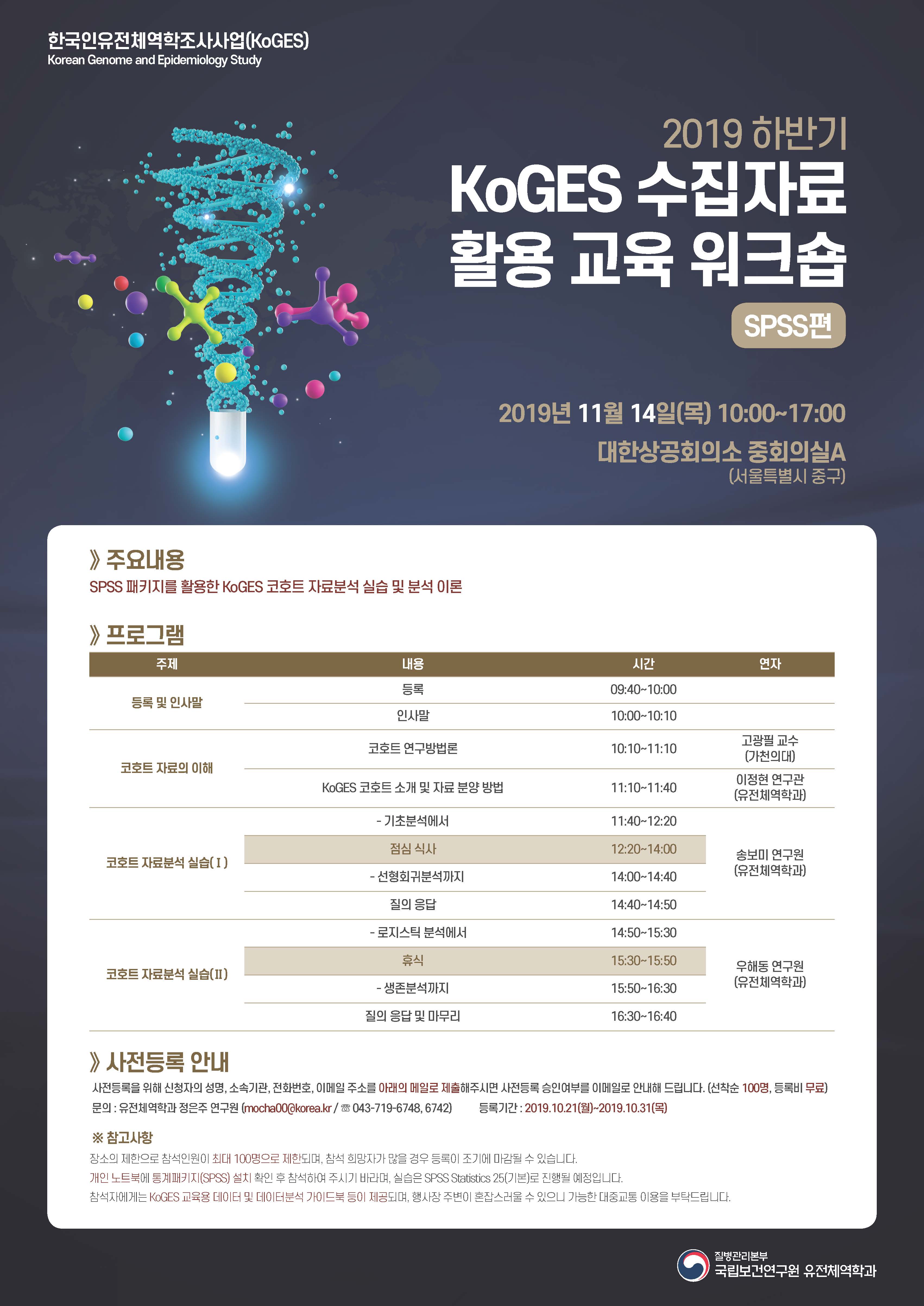 질병관리본부 국립보건연구원 유전체역학과에서는 한국인유전체역학조사사업(KoGES) 코호트 자료에 대한 연구자의 이해를 높이고 연구 활성화를 위하여 KoGES 수집자료를 활용한 자료분석 실습 및 분석 이론 교육을 아래와 같이 개최하고자 하오니, 학회원 대상 홍보 및 참여 독려 등의 협조를 요청 드립니다. 가. 행사명 : 2019 하반기 한국인유전체역학조사사업(KoGES) 수집자료 활용 교육 워크숍(SPSS편) 나. 일시 : 2019. 11. 14(목) 10:00~17:00 다. 장소 : 대한상공회의소 중회의실 A (서울 중구) 라. 참석대상 : 선착순 100명 (국내 보건, 역학, 임상의학, 유전학, 식품영양 등 관련 분야 연구자 및 학생 등) 마. 주요내용 : SPSS 패키지를 활용한 KoGES 코호트 자료분석 실습 및 분석 이론 바. 사전등록 기간 : 2019.10.21(월)~10.31(목) 사. 교육신청 방법 및 안내 (붙임 참조) - 신청자의 성명, 소속, 전화번호, 이메일 주소를 전자우편(mocha00@korea.kr)으로 송부 - 기타 자세한 사항은 첨부된 워크숍 포스터에서 확인 바랍니다. 질병관리본부