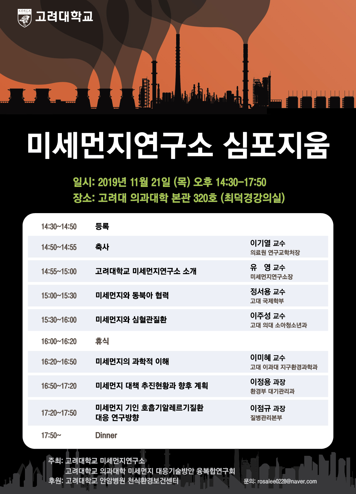 오는 11월 21일(목)에 고려대학교 의과대학 본관 320호에서 미세먼지연구소 심포지움을 개최합니다.