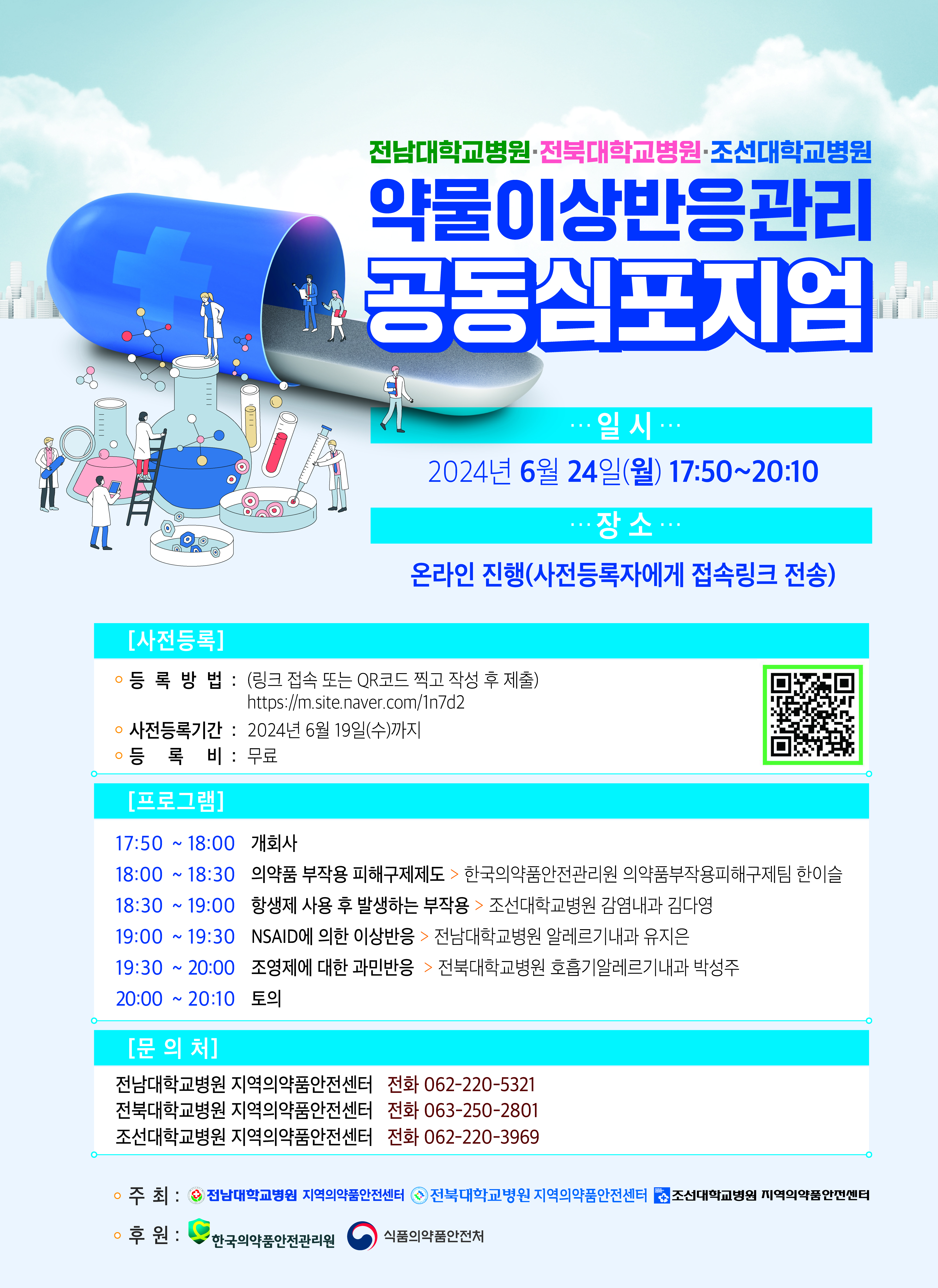 유관기관 전남대학교병원‧전북대학교병원‧조선대학교병원 약물이상반응관리 공동심포지엄 조회수 : 432 게시일 : 2024-05-23 전남대학교병원, 전북대학교병원, 조선대학교병원 지역의약품안전센터에서 아래와 같이 심포지엄을 개최합니다. - 행사명: 전남대학교병원‧전북대학교병원‧조선대학교병원 약물이상반응관리 공동심포지엄 - 일시 : 2024년 6월 24일(월) 17:50~20:10 - 장소 : 온라인(Zoom) 문의처: 062-220-5321 포스터.jpg (다운로드 : 208회) 목록