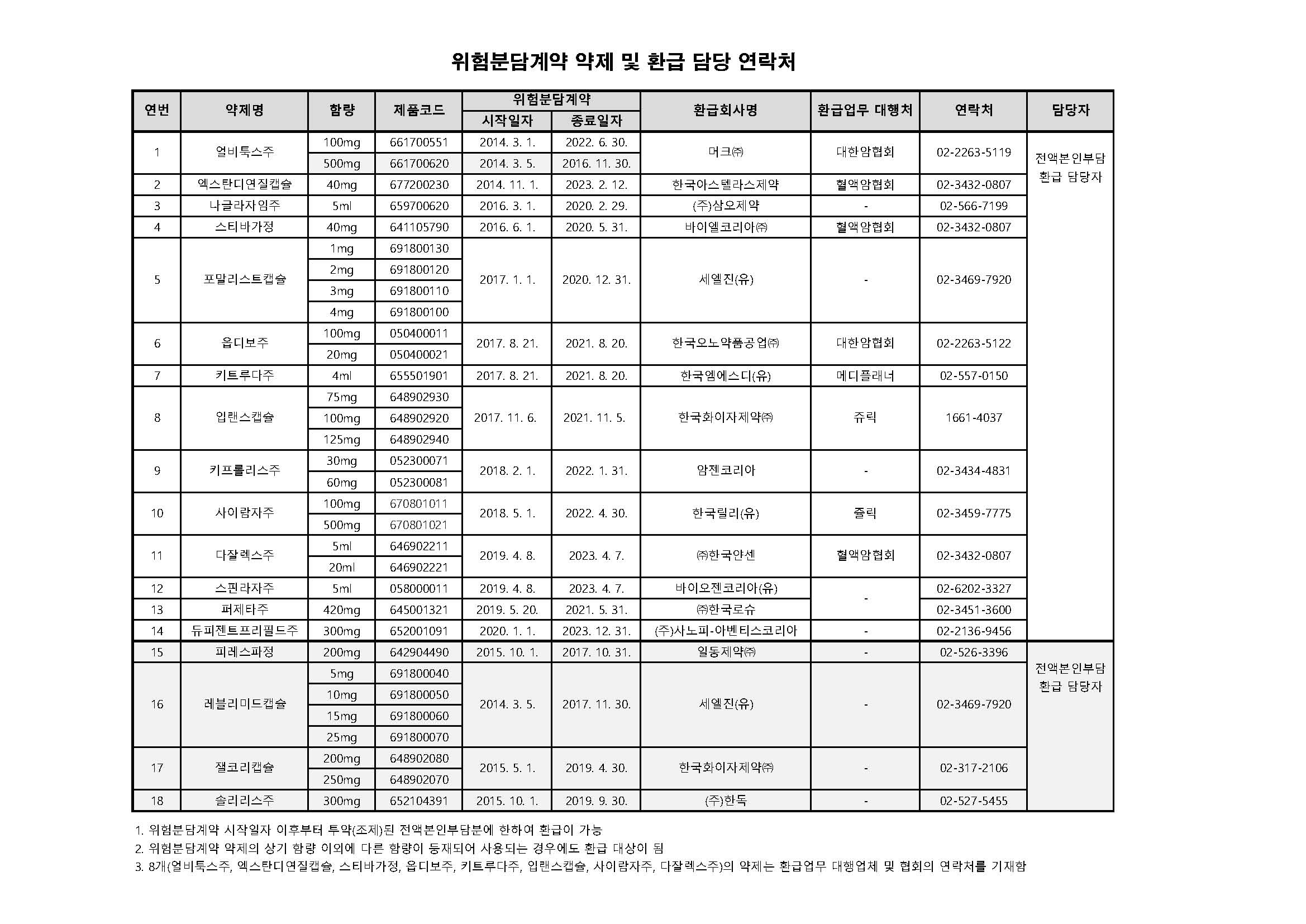 제 목 위험분담계약 약제 전액본인부담환자 환급안내 요청 1. 관련근거 : 국민건강보험공단 약가협상부-157(2020.2.6.) 2. 국민건강보험공단에서 4대 중증질환 보장성 강화를 위해 ’14. 1.부터 운영하고 있는 위험분담제도는 급여 등재 시 약제의 효능·효과 및 보험재정 영향 등 에 대한 불확실성을 분담하기 위한 제도로서 제약사가 해당 약제 청구금액 중 일정금 액을 공단에 상환하고 있습니다. 3. 건보공단과 제약사가 체결한 위험분담계약에 따라 환자가 해당약제를 투여받고 약값 전액을 부담한 경우(100분의100 본인부담), 환자는 제약사로부터 약값 의 일정금액을 환급 받을 수 있습니다. 4. 위와 관련, 건보공단에서 붙임의 위험분담계약 약제를 전액본인부담으 로 처방(또는 조제)시, 환자에게 제약사로부터 약값의 일부를 환급 받을 수 있다는 사 실과 해당 약제환급 담당자 연락처를 안내해 줄 것을 요청해온바, 이를 전달해 드리오 니 귀 회 소속 회원님이 참고하실 수 있도록 안내하여 주시기 바랍니다. 5. 아울러, 건보공단도 환급이 누락되지 않도록 위험분담계약 약제의 전액 본인부담 환자에게 환급받을 수 있다는 사실을 안내할 예정인바, 각 요양기관에서 위 험분담 계약 약제를 전액본인부담으로 처방(또는 조제)시, 보건복지부 고시“요양급여 비용청구방법, 심사청구서·명세서서식 및 작성요령”에 따라 공단에 U항(건강보험 100분의100본인부담)으로 청구하도록 안내하여 주시기 바랍니다. - 아 래 - 1. 위험분담계약 시작일자 이후부터 투약(조제)된 전액본인부담분에 한하여 환급이 가능 2. 위험분담계약 약제의 상기 함량 이외에 다른 함량이 등재되어 사용되는 경우에도 환급 대상이 됨 3. 8개(얼비툭스주, 엑스탄디연질캡슐, 스티바가정, 옵디보주, 키트루다주, 입랜스캡슐, 사이람자주, 다잘렉스주)의 약제는 환급업무 대행업체 및 협회의 연락처를 기재함 붙임 : 위험분담계약 약제 및 환급 담당 연락처. 끝.