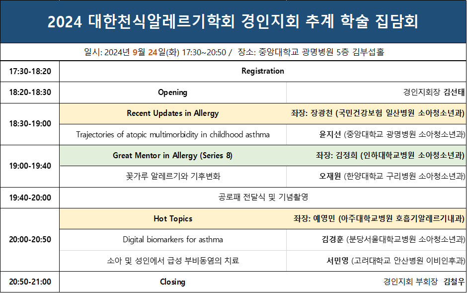 2024년 대한천식알레르기학회 경인지회 추계 학술집담회 안내