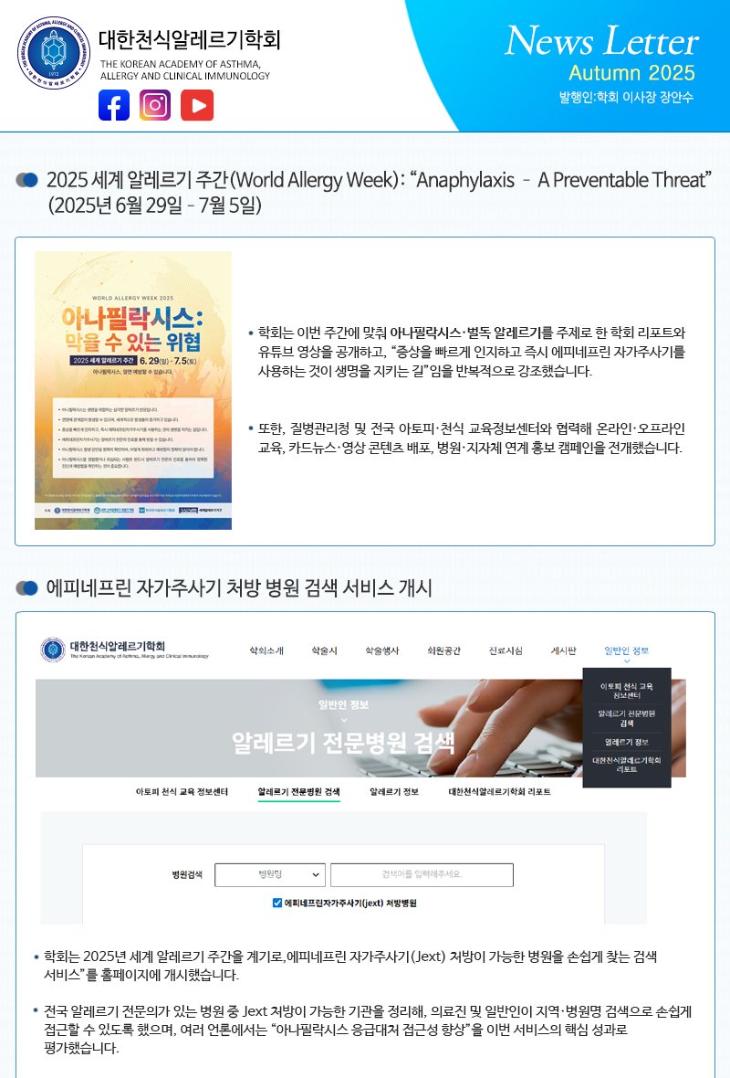 학술지 및 간행 학회소개 학회소식 자료실 학술지 및 간행 학술행사 진료지침 일반인정보 Membership / My Page 뉴스레터 뉴스레터 최신논문소식 교과서 안내 AAIR AARD 천식 및 알레르기
