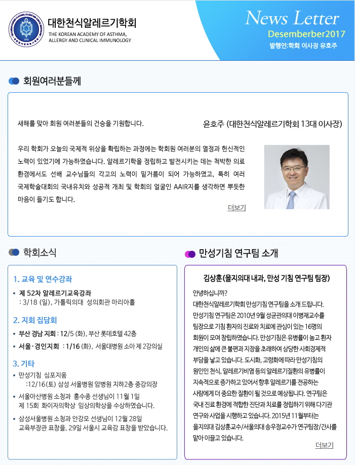 전체 메뉴 학회소개 인사말 학회 역사 & 연혁 미션 & 비전 회칙 임원 위원회 평의원 지회 연구팀 오시는길 학회소식 공지사항 시상내역 분과전문의 자격시험 자료실 천식 E-러닝 자료실 서식 학술지 및 간행 뉴스레터 최신논문소식 교과서 안내 AARD소개 AAIR소개 천식 및 알레르기 학술행사 행사일정 국외학술대회참가신청 국내학술대회 교육강좌 역대학술대회 포토갤러리 진료지침 진료지침 개발 중 진료지침 일반인정보 아토피 천식 교육 정보센터 알레르기 전문병원 검색 알레르기 정보 대한천식알레르기학회 리포트 Membership / My Page 로그인 아이디 / 비밀번호 찾기 회원가입 안내 개인정보취급방침 메뉴 닫기