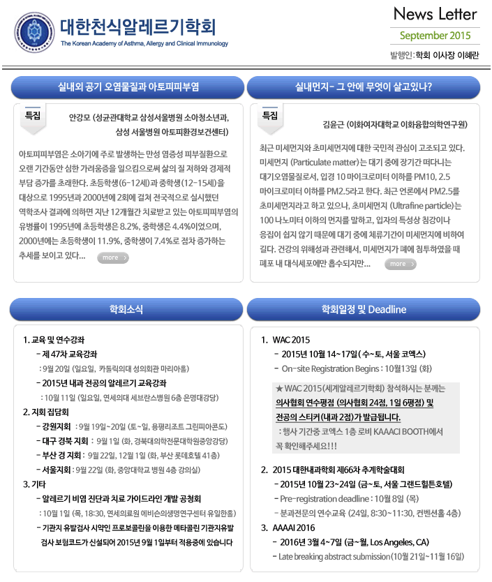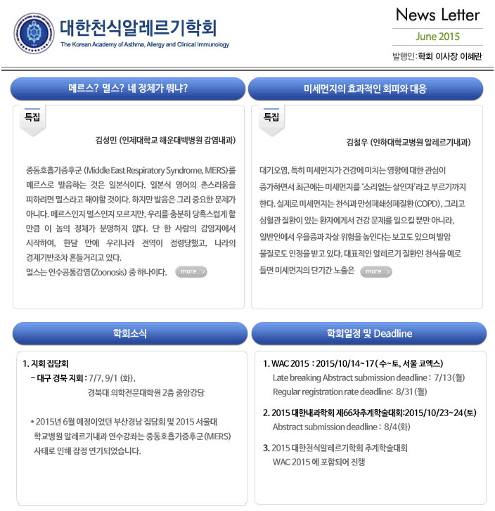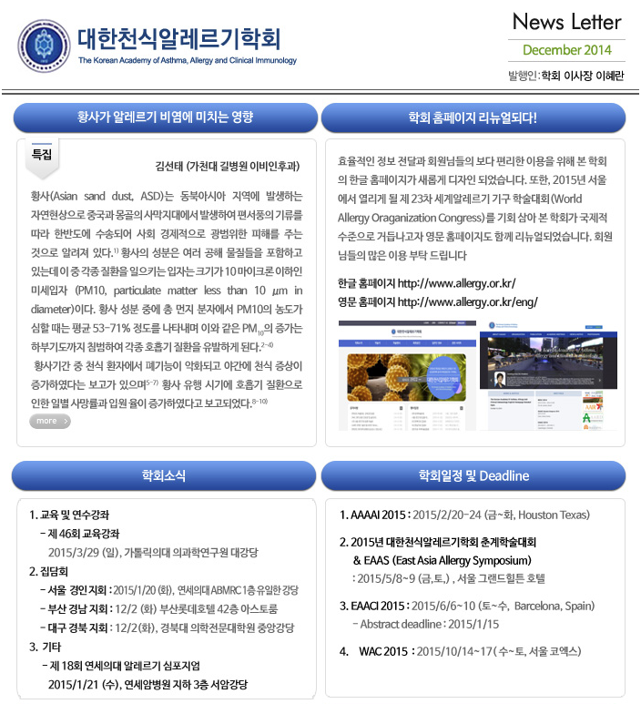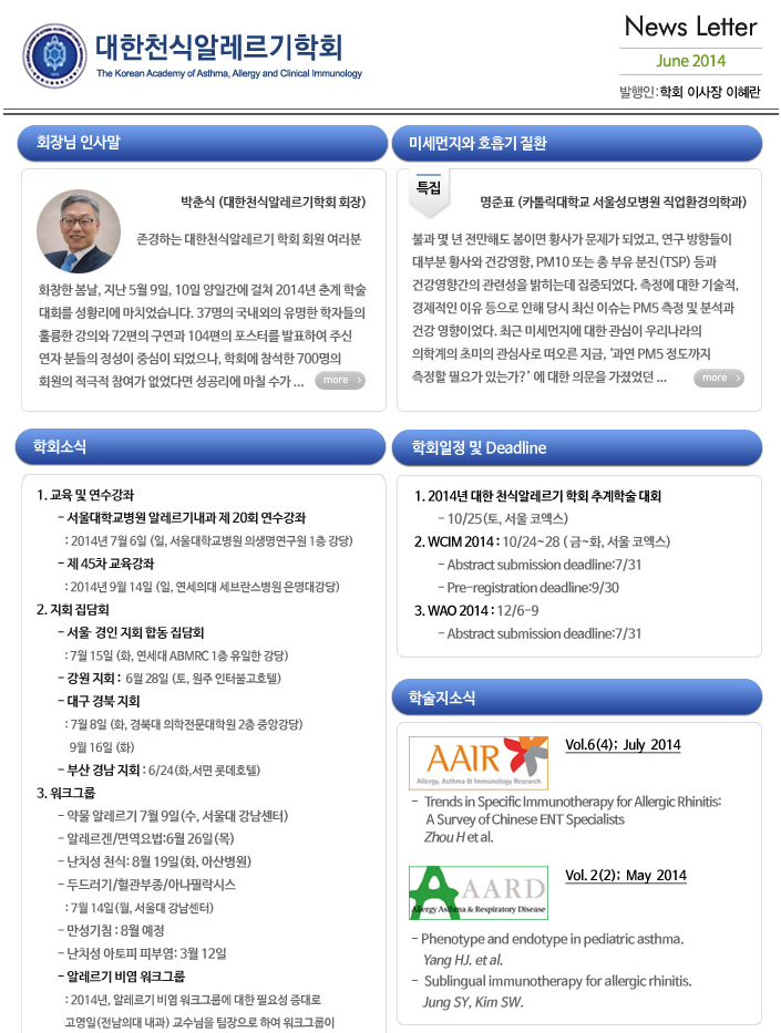 학술지 및 간행 학회소개 학회소식 자료실 학술지 및 간행 학술행사 진료지침 일반인정보 Membership / My Page 뉴스레터 뉴스레터 최신논문소식 교과서 안내 AARD소개 AAIR소개 천식 및 알레르기