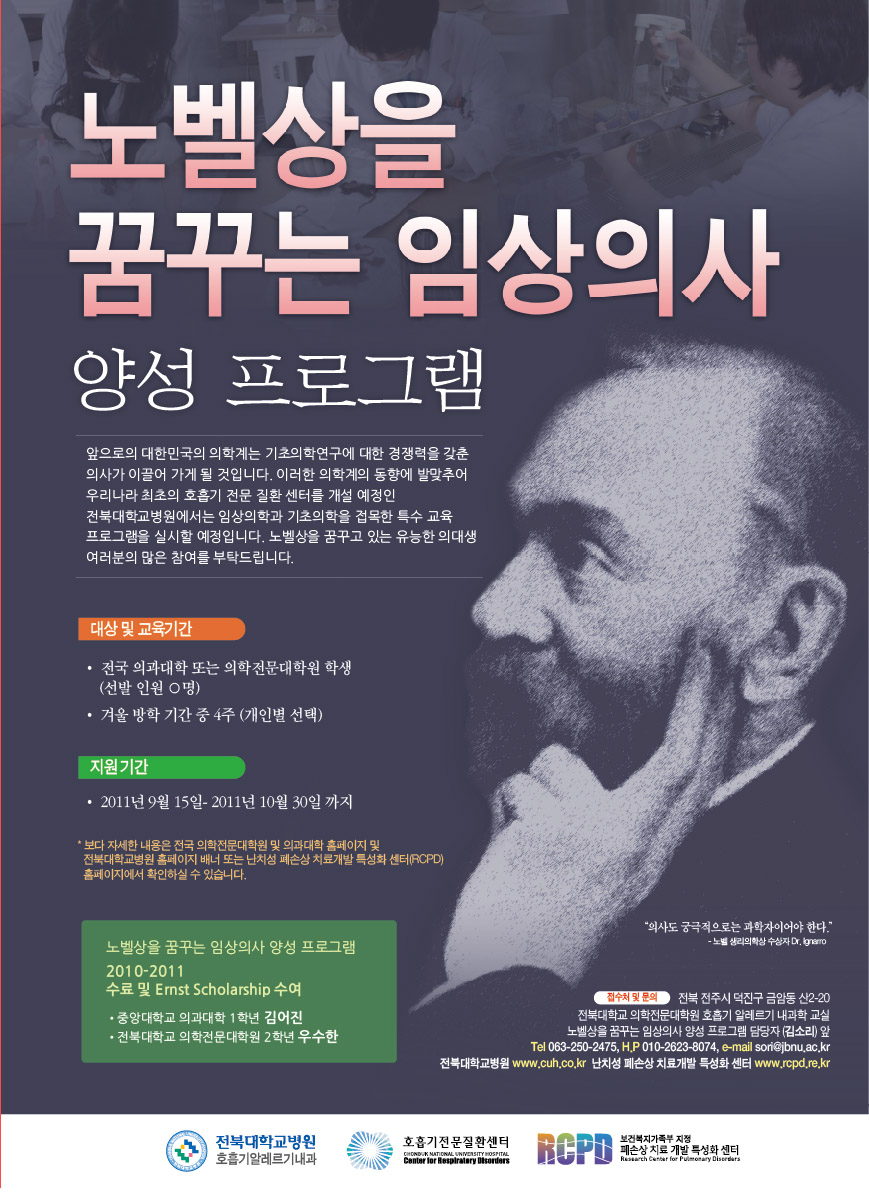 앞으로의 대한민국의 의학계는 기초의학연구에 대한 경쟁력을 갖춘 의사가 이끌어 가게 될 것입니다. 이러한 의학계의 동향에 발맞추어 우리나라 최초의 호흡기 전문 질환 센터를 개설 예정인 전북대학교병원에서는 임상의학과 기초의학을 접목한 특수 교육 프로그램을 실시할 예정입니다.