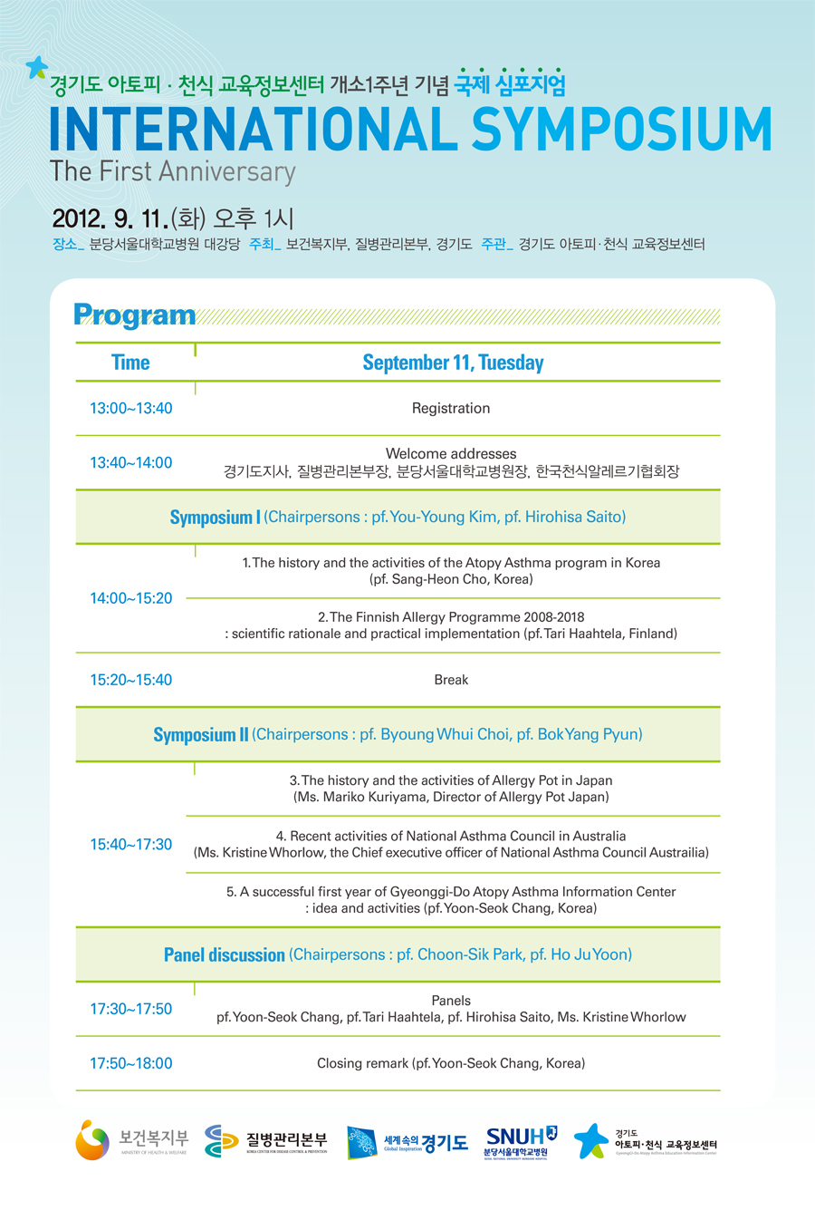 2011년 10월, 경기도와 보건복지부, 질병관리본부의 지원을 받아 전국 도 단위 최초로 설립된 경기도 아토피·천식 교육정보센터가 개소 1주년을 맞이하여 국제심포지엄을 다음과 같이 개최합니다.