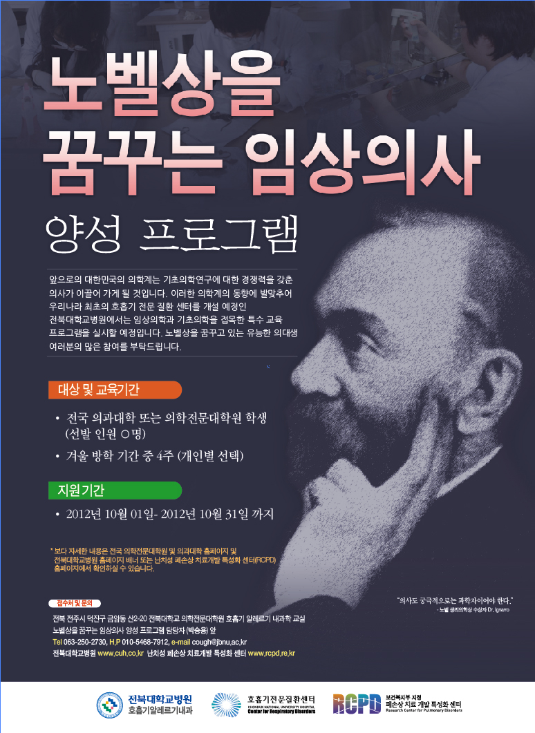 앞으로의 대한민국의 의학계는 기초의학연구에 대한 경쟁력을 갖춘 의사가 이끌어 가게 될 것입니다. 이러한 의학계의 동향에 발맞추어 우리나라 최초의 호흡기 전문 질환 센터를 개설 예정인 전북대학교병원에서는 매년 임상의학과 기초의학을 접목한 특수 교육 프로그램을 실시해 오고 있습니다.
