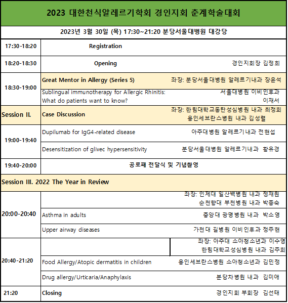 2023년 대한천식알레르기학회 경인지회 춘계 학술집담회 안내