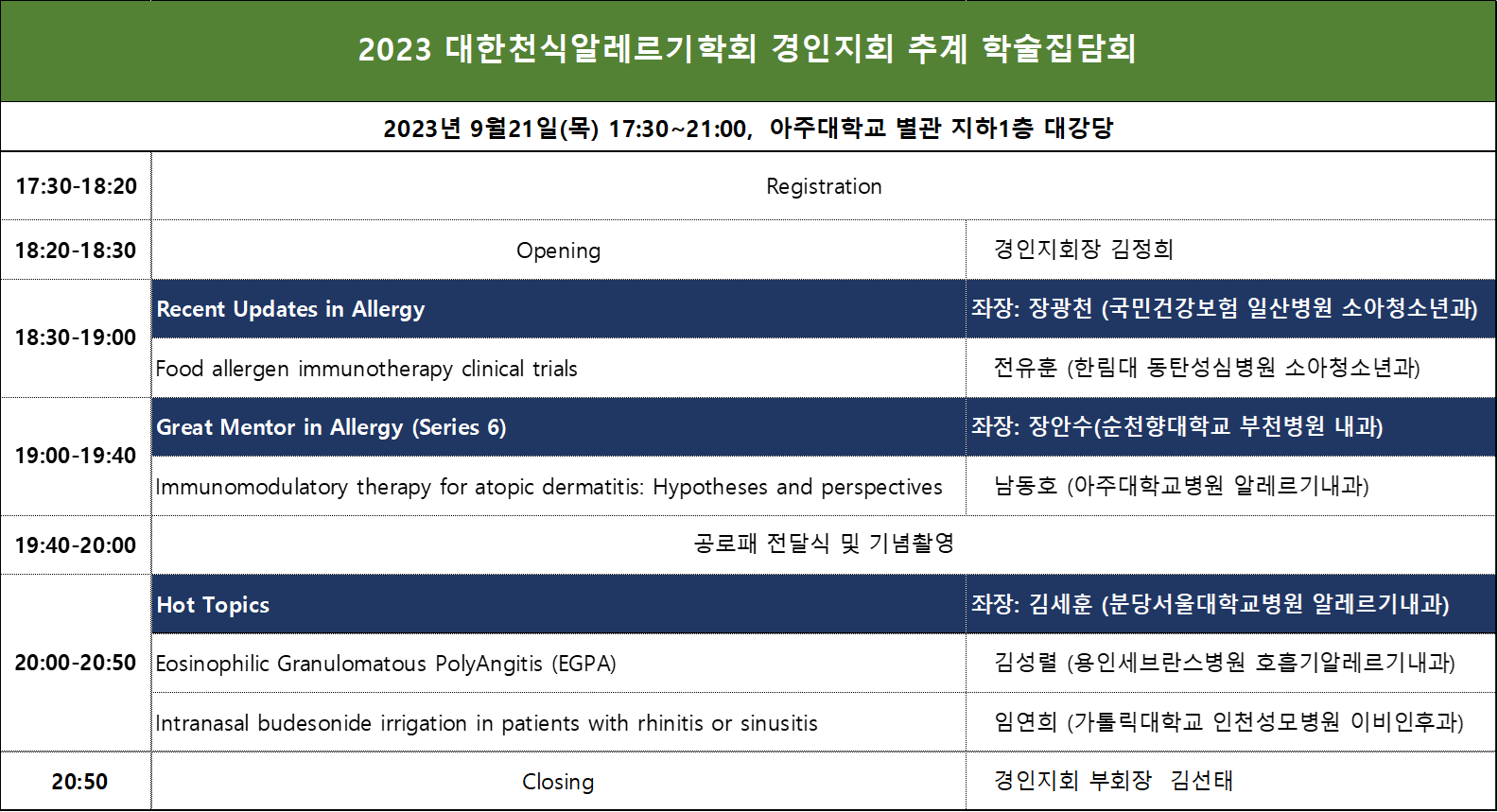 2023년 9월 21일 가을의 길목에서 여러 회원들간 교제, 그리고 새로운 지식을 습득할 수 있는 소중한 시간이 될 수 있도록 대한천식알레르기학회 경인지회 추계 학술집담회를 개최하게 되었습니다.