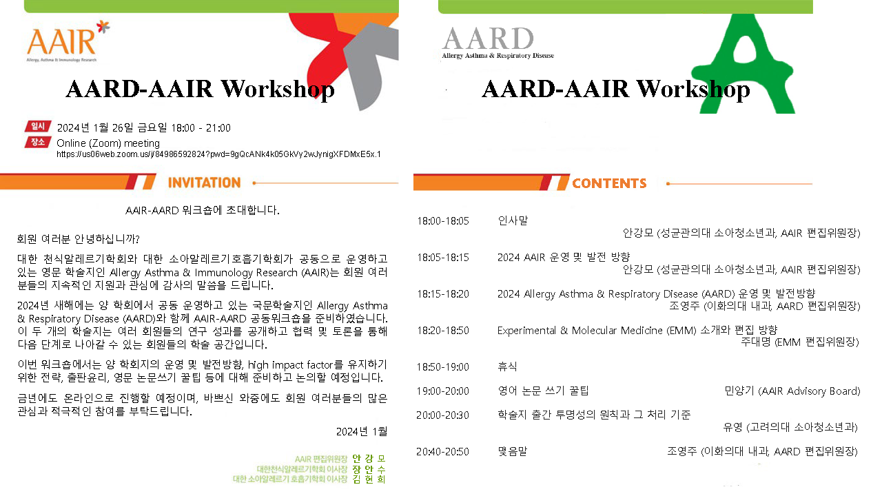 공지사항 2024년 AARD-AAIR 워크숍 안내 조회수 : 698 게시일 : 2024-01-08 Online (Zoom) meetinghttps://us06web.zoom.us/j/84986592824?pwd=9gQcANk4k05GkVy2wJynigXFDMxE5x.1 2024 AARD-AAIR Workshop 초대장.pdf (다운로드 : 115회) 목록