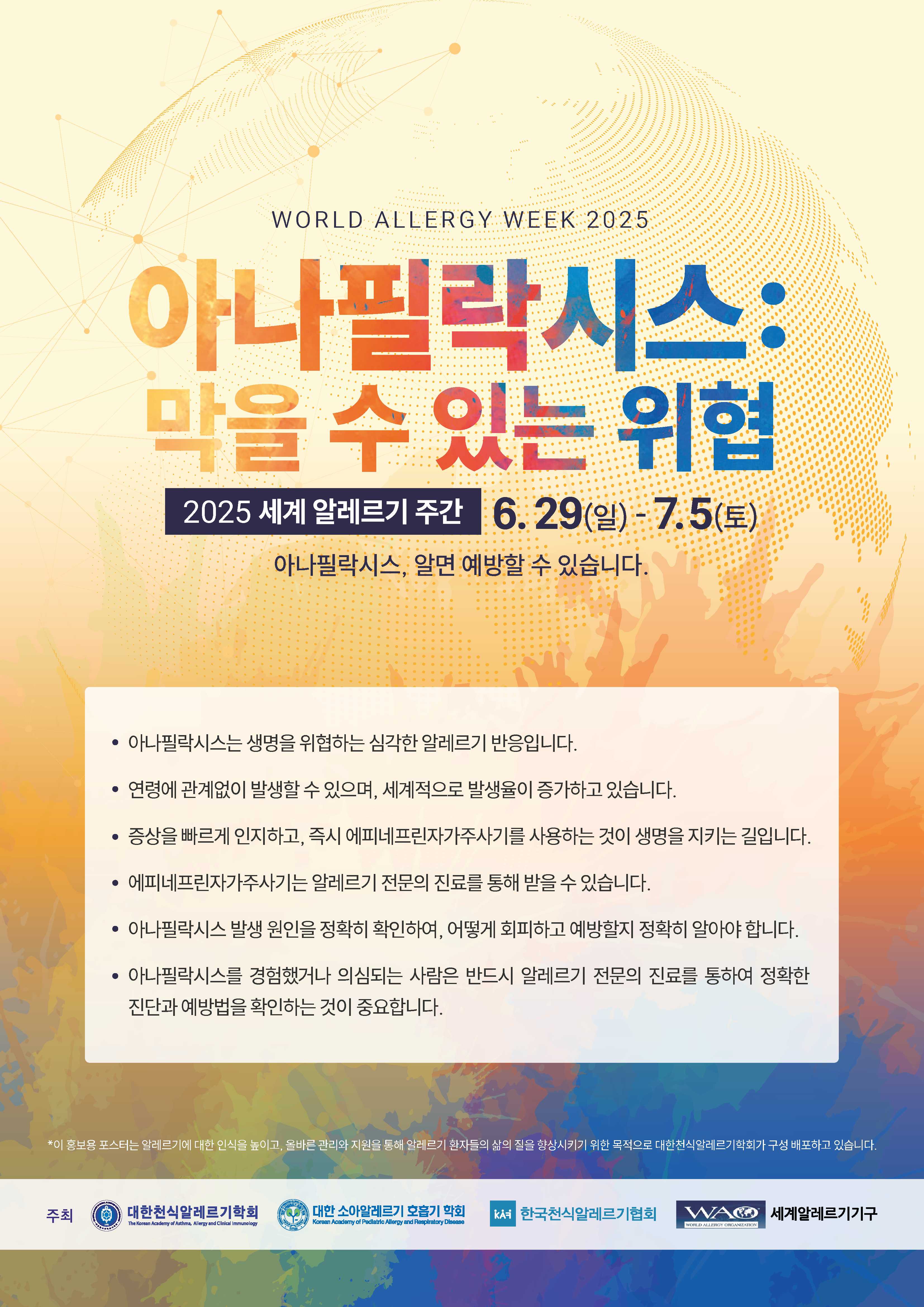 2025년 World Allergy Week (6월 29일~7월 5일) 의 주제는 "Anaphylaxis"입니다.