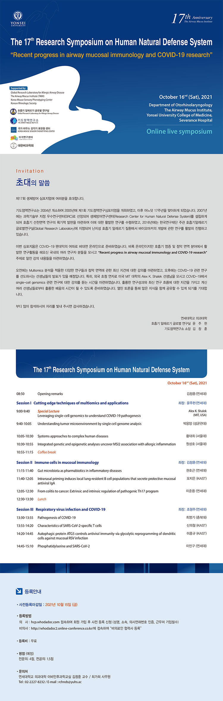 유관기관 연세의대 기도점액연구소 제 17차 생체방어심포지엄 (10/16, 토) 조회수 : 913 게시일 : 2021-09-29 연세의대 기도점액연구소에서 10월 16일(토)에 제 17차 생체방어심포지엄을 개최합니다. 자세한 내용은 첨부 파일 확인 부탁드리며, 많은 관심과 참여 바랍니다. - 장소: Online 개최 - 주최/주관 기도점액연구소 - 사전접수 2021.09.29 – 2021.10.15 The17thResearchSymposiumonHumanNaturalDefenseSystem리플렛.jpg (다운로드 : 123회) 목록